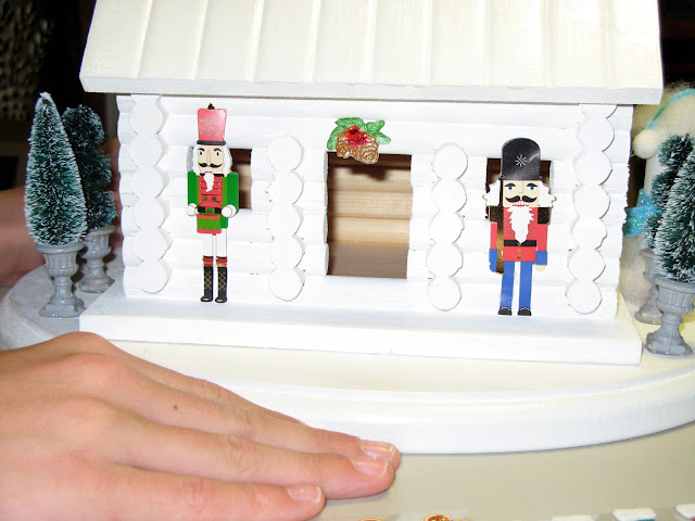 While we were looking at the bright and cheery Christmas decorations Noodles decided that painting the log cabin white would really make the Christmas decorations stand out. So, we decided to exchange the brown paint for white paint.